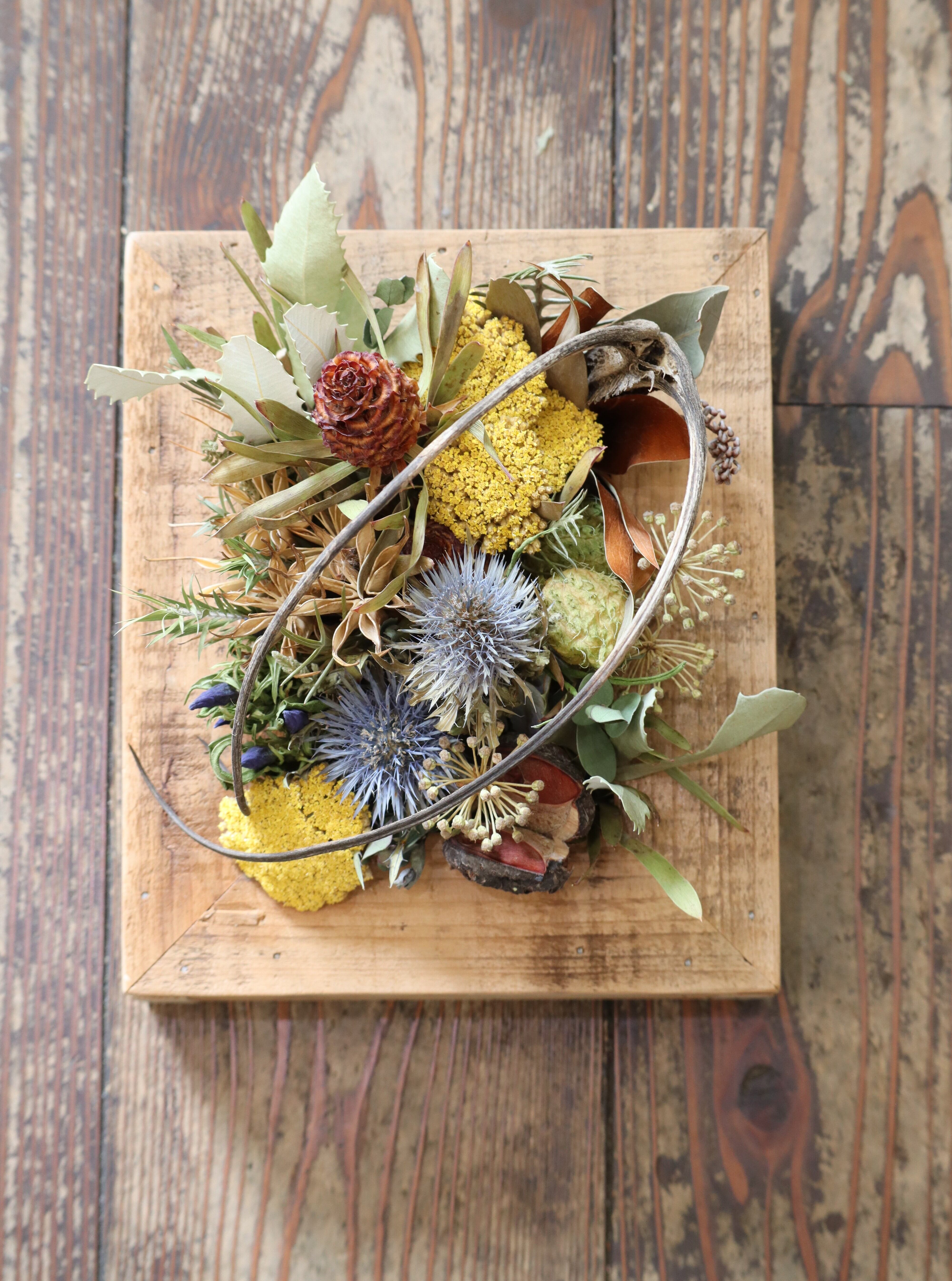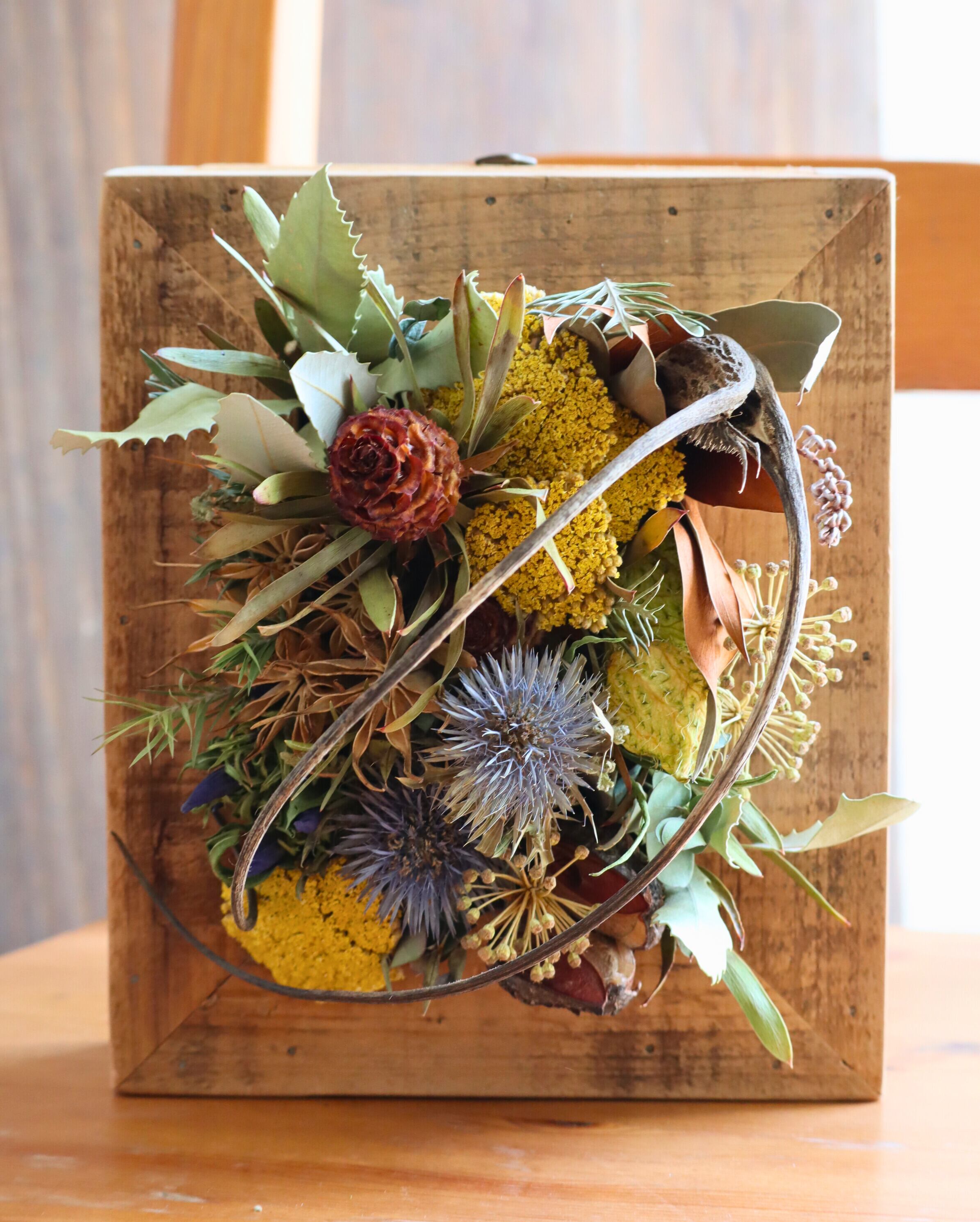 ハンサムなドライフラワーをぎゅっと詰め込んだ、スクエア型の壁飾り。